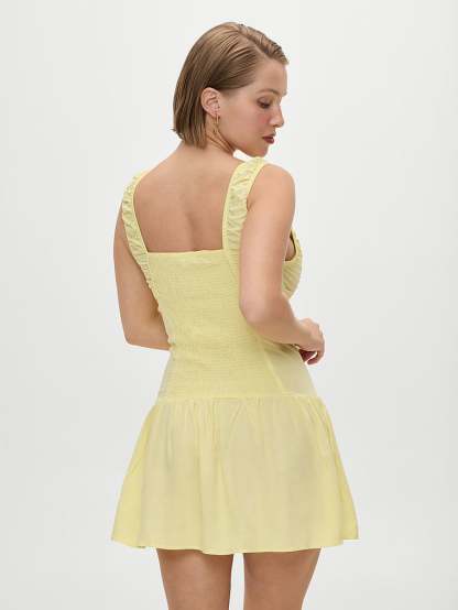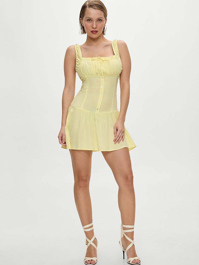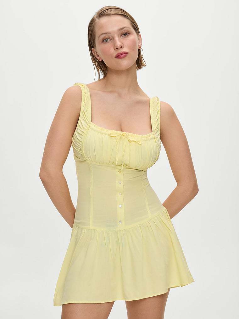 Spring just got brighter: Inspired by prairie strolls and wildflower-filled meadows, this sweet Dress features a ruched bust with self-tie detail, button accents, and a romantic, flouncy skirt.